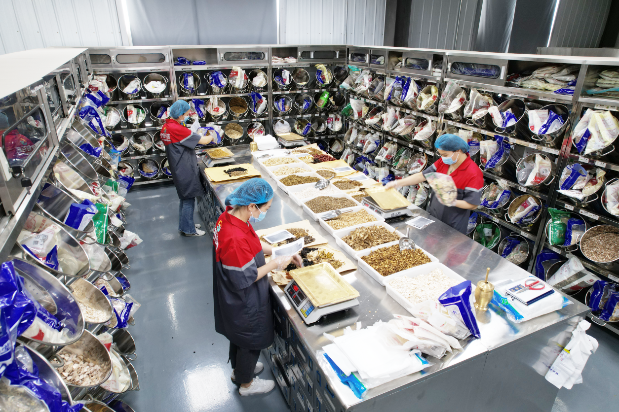 煎药中心占地面积600余平方。设有储藏、调配、浸泡、煎煮、清洗等功能区域。设有接方室、调剂间、泡药间、煎药间及包装间等区域。实现全流程自动化煎煮,打造数字化流程,目前一期投入国内最先进的全自动煎药机组共计50台,日煎药能力1000余份,由“北京东华源”提供数字化煎药设备及软件。全自动煎药机具备一煎、二煎、自动搅拌、密封常压、先煎后下、浸泡、定量加水、自动药渣分离、挤压坚实等10余项先进功能。该设备全程密闭煎煮以及高压灭菌的工序极大保证了中药汤剂的安全性。同时,全程密闭的科学煎煮也有效解决了传统煎药锅的诸多弊端。全域流程采用独一条形码管理,随处方从调剂、复核、泡药、煎药、发货全过程监控,实现实时记录,随时追溯。